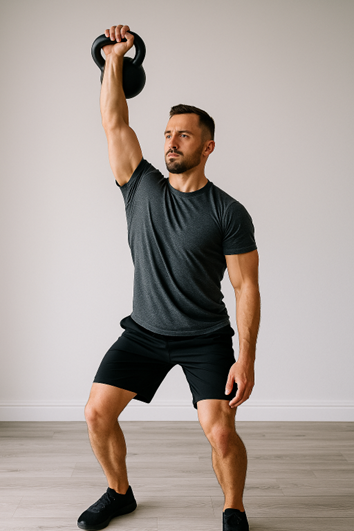 Tämä dynaaminen kahden vaiheen liike vahvistaa tehokkaasti sekä ylä- että alavartaloa. Se alkaa voimakkaalla nostolla maasta ja päättyy vakaaseen punnerrukseen pään yläpuolelle – erinomainen koko kehon voimaharjoitus.
