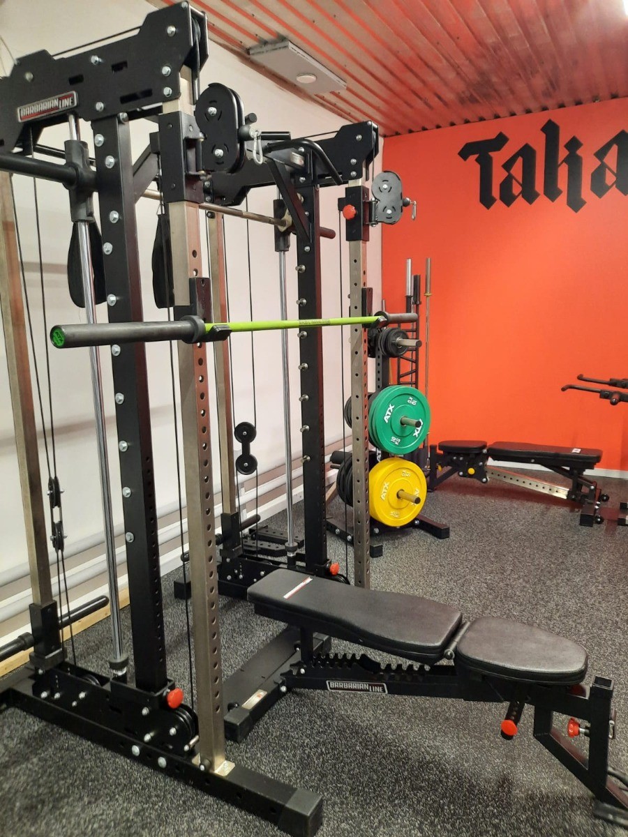 Ensimmäiset hankinnat olivat soutulaite ja voimapuolelta räkki sekä painot. ”Silloin jo tiesin, että tämä lähtee tästä laajenemaan,” muistelee Takala. Sitten tuli käsipainot ja ristikkäistalja, joka vaatii jo enemmän tilaa. ”Kun tilaa on niin miksei,” tokaisee Takala kotisalinsa laajentamisesta. Ja tämä kotisali onkin poikkeuksellisen kookas tila - reilusti yli 100m2. Tila mahdollistaa ison ruohomattoalueen monipuoliseen toiminnalliseen treeniin, kuten kelkan työntäminen tai askelkävelyt painojen kanssa. Toki jos on tilat rajoitteena, niin sen mukaan on mentävä. Takaloilla on siitä suotuisa tilanne, ettei tilasta tarvinnut tinkiä. Takalat harjoittelevat mielellään vapailla painoilla ja nekin vaativat yllättävän paljon tilaa ympärilleen.